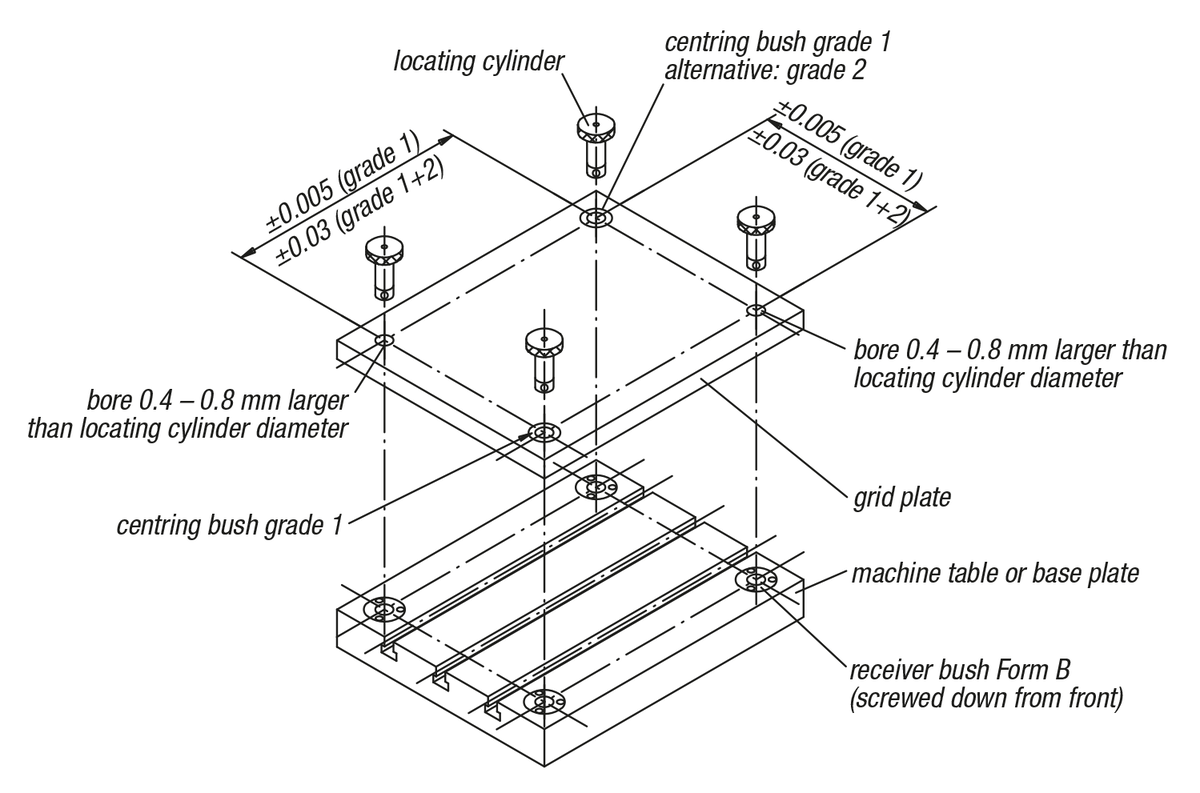 The centring bushes are pressed into the receiver holes of the tooling plates using a light pressure.