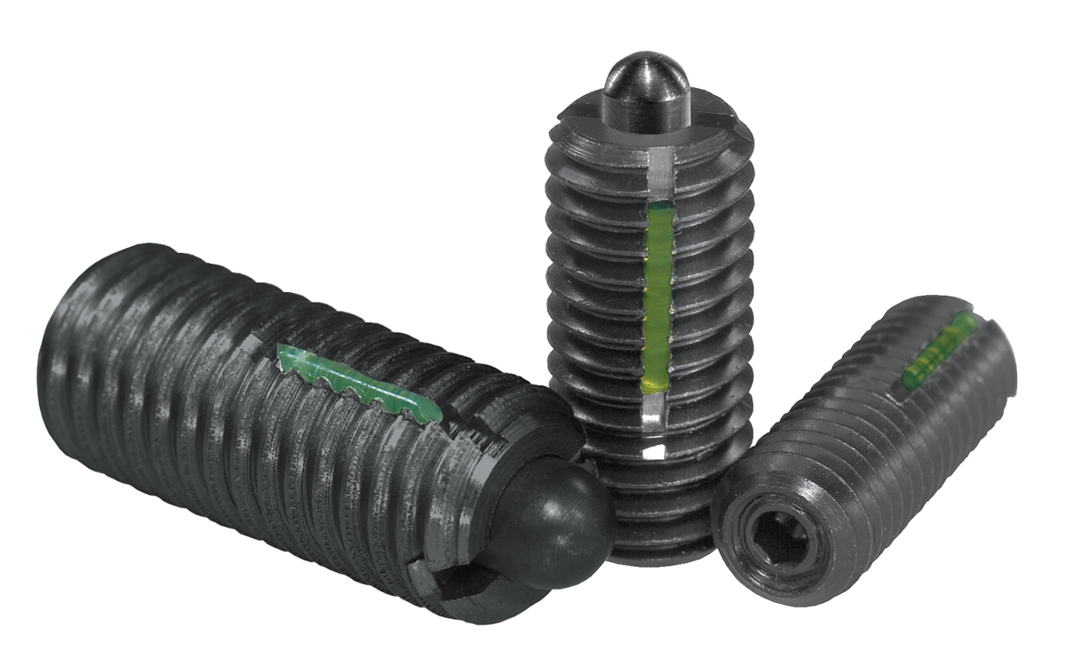 Spring plungers with hexagon socket and thrust pin, steel, standard spring force, with thread lock