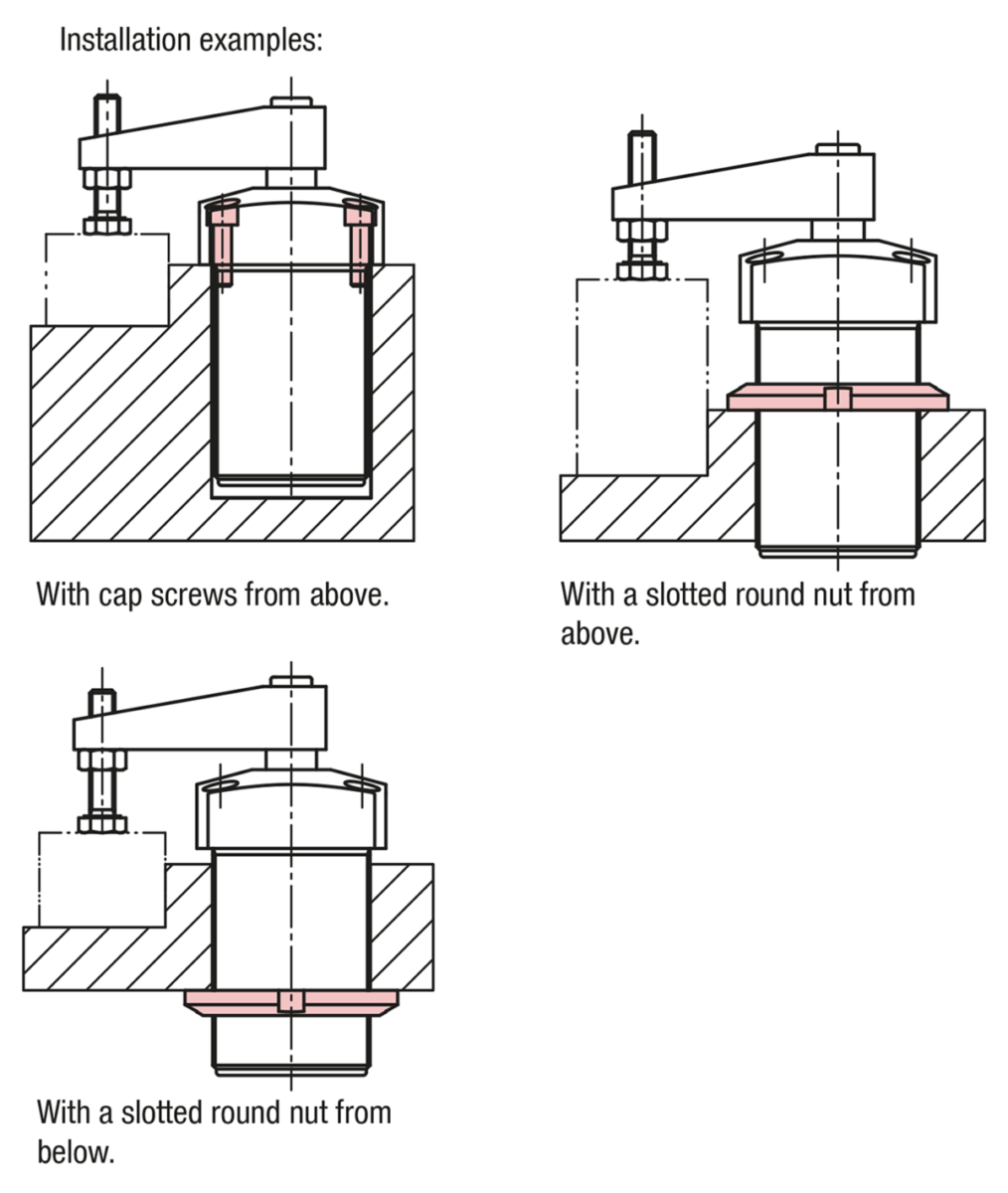 The screw-in swing clamp with flange can be fastened from above or below using a DIN 70852 slotted round nut (07590-05). Another option is to fasten the swing clamp to the fixture from above using four cap screws.