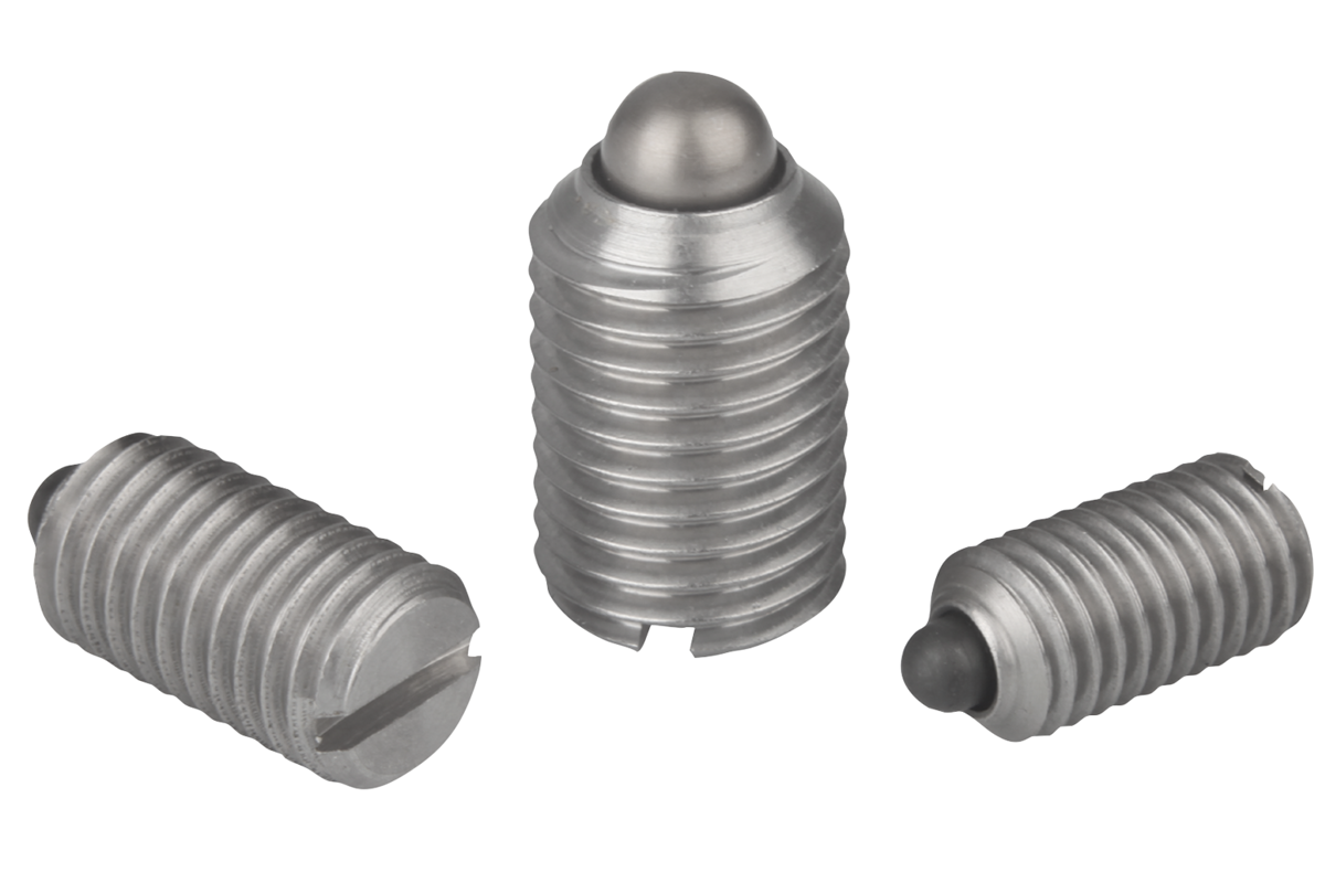 Spring plungers with slot and thrust pin, stainless steel, standard spring force