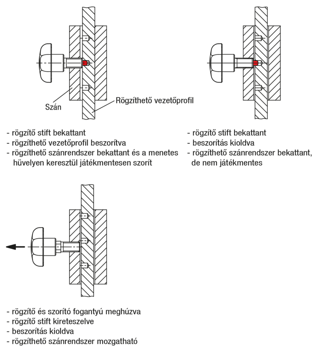 A rögzítő és szorító fogantyú egy termékként lehetővé teszi különböző beállító elemek pozicionálását, reteszelését és beszorítását. A reteszelés alakzáró módon csap segítségével, a beszorítás erőzáró módon a hüvely homlokfelületén át történi.
