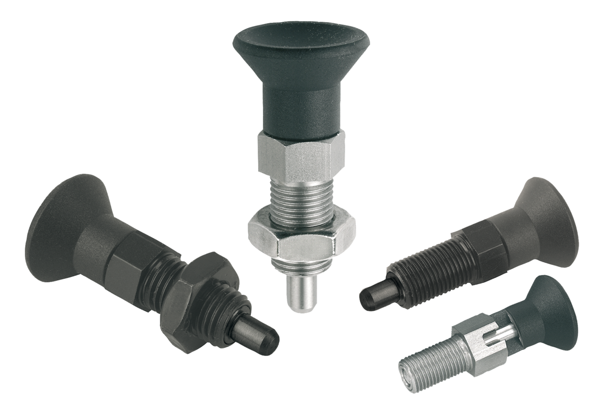 Rögzítőcsapok, acél vagy nemesacél, műanyag gomba alakú fogantyúval, hosszabbított rögzítőstifttel, reteszhoronnyal és ellenanyával
