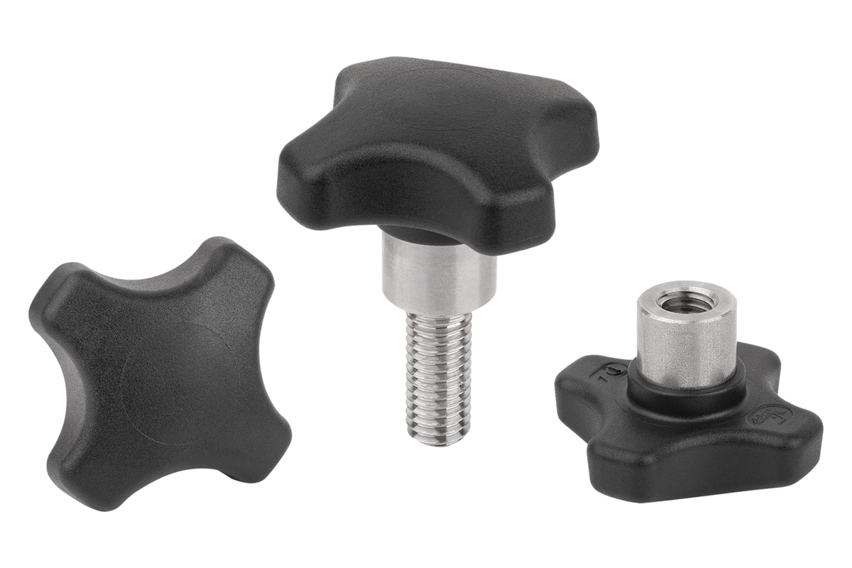 Műanyag keresztmarkolatok magas hőmérsékletnek ellenálló kiálló acélpersellyel, K alak: menetes persely